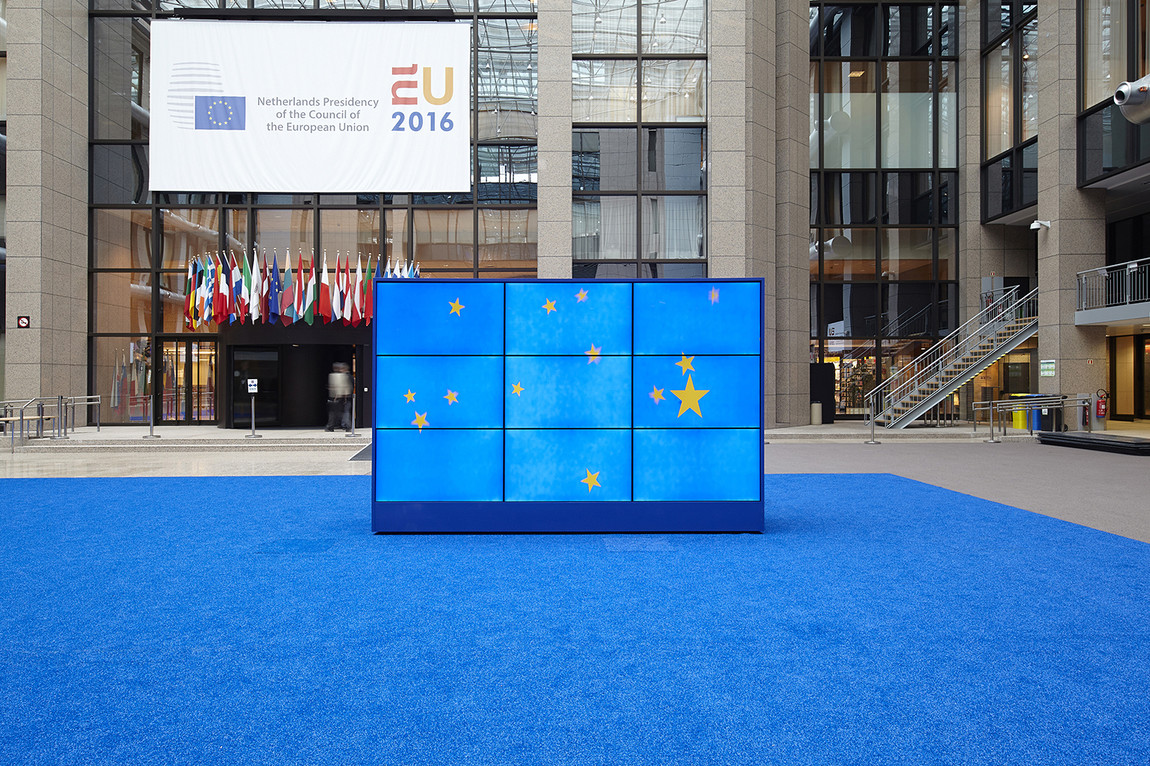 Interactive blue screen installation for the European Council in Brussels. With and commissioned by XML architects and Jurgen Bey who developed and designed the carpet and architectural pieces of the interior.